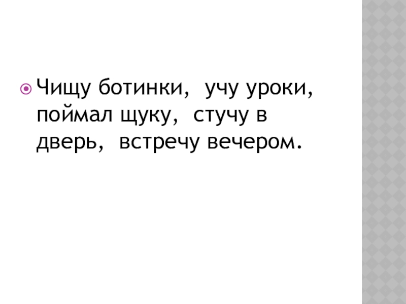 Слайд 3Чищу ботинки, учу уроки, поймал щуку, стучу в дверь, встречу вечером.