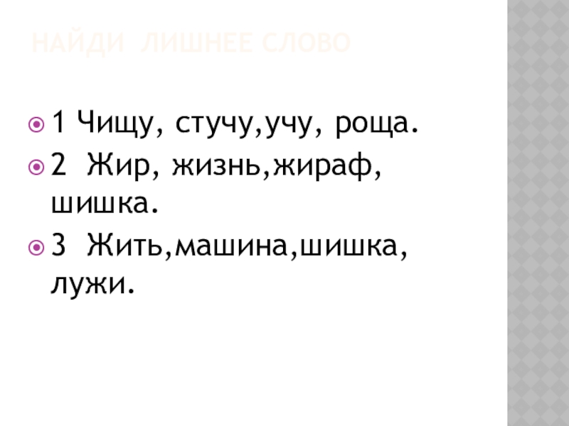 Найди лишнее слово 1 Чищу, стучу,учу, роща.2 Жир, жизнь,жираф, шишка.3 Жить,машина,шишка, лужи.