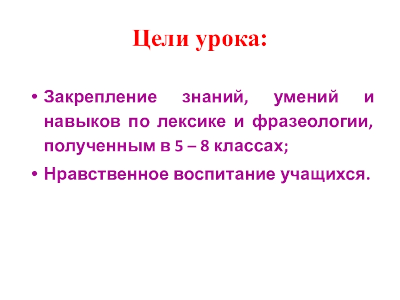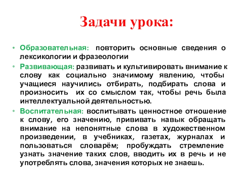 Образовательная: повторить основные сведения о лексикологии и фразеологии