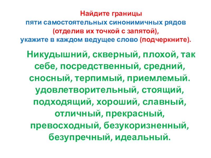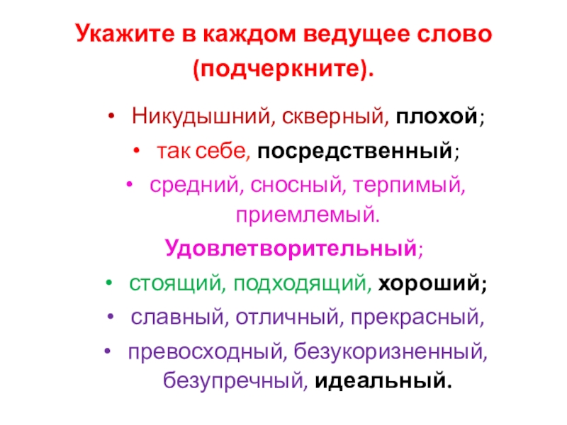 Никудышний, скверный, плохой, так себе, посредственный, средний, сносный, терпимый, приемлемый. удовлетворительный, стоящий, подходящий, хороший, славный, отличный, прекрасный, превосходный, безукоризненный, безупречный, идеальный.