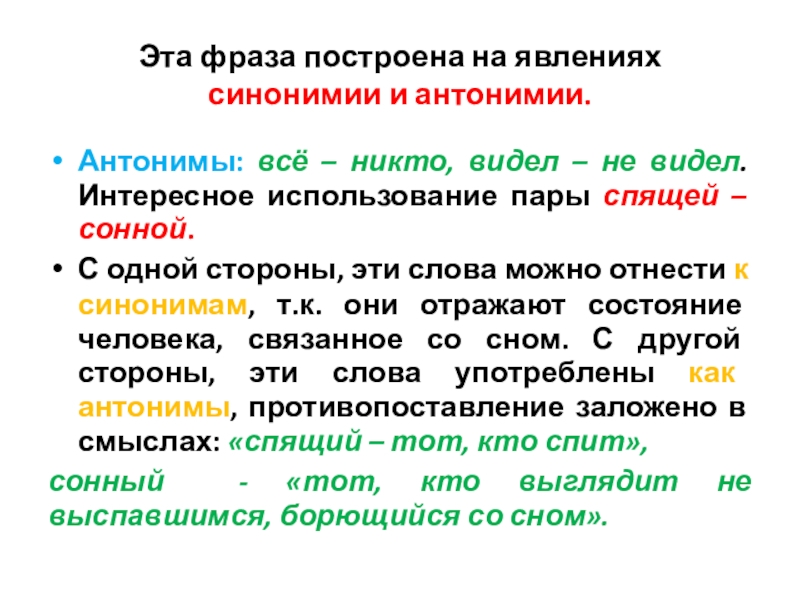 С одной стороны, эти слова можно отнести к синонимам, т.к. они отражают состояние человека, связанное со сном. С другой стороны, эти слова употреблены как антонимы, противопоставление заложено в смыслах: «спящий – тот, кто спит»,