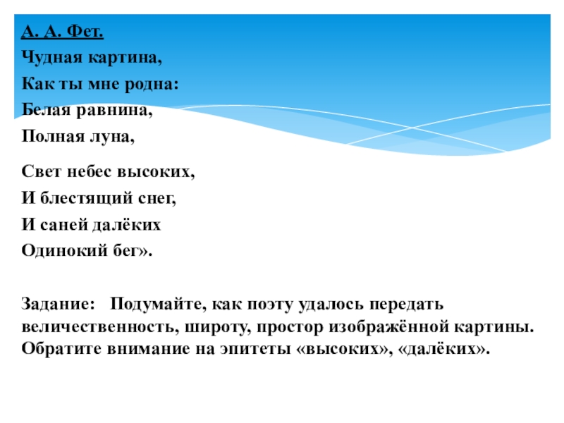 Задание: Подумайте, как поэту удалось передать величественность, широту, простор изображённой картины. Обратите внимание на эпитеты «высоких», «далёких».