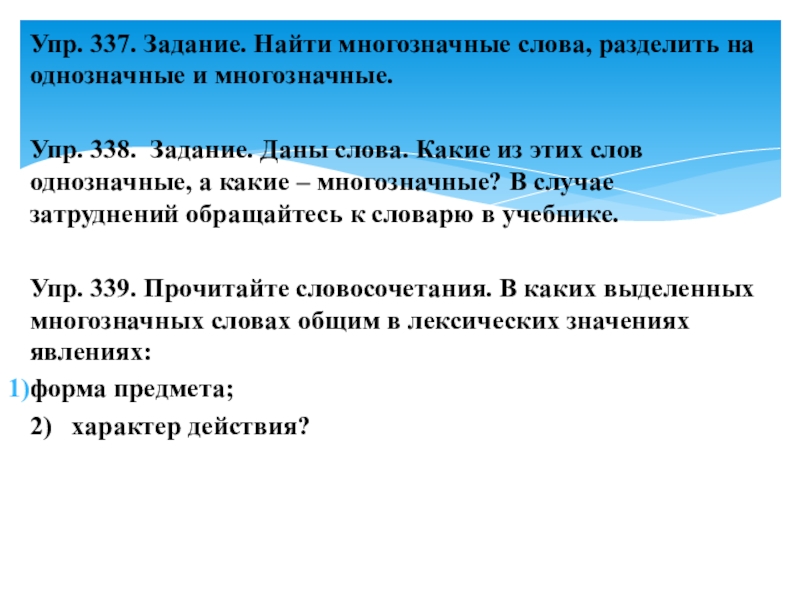 Слайд 29Упр. 337. Задание. Найти многозначные слова, разделить на однозначные и многозначные.