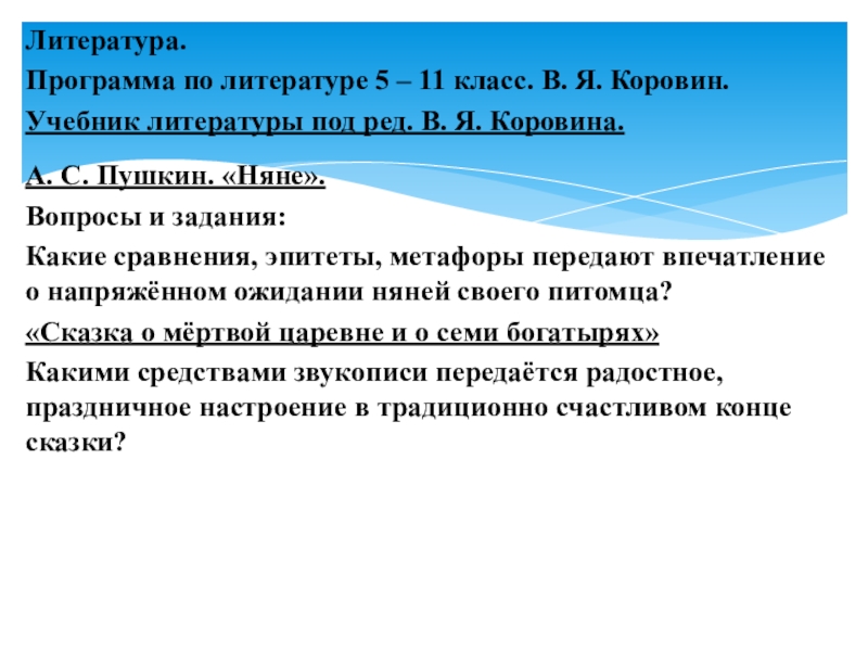 Программа по литературе 5 – 11 класс. В. Я. Коровин.