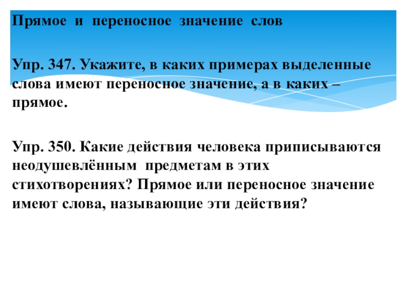 Упр. 350. Какие действия человека приписываются неодушевлённым предметам в этих стихотворениях? Прямое или переносное значение имеют слова, называющие эти действия?