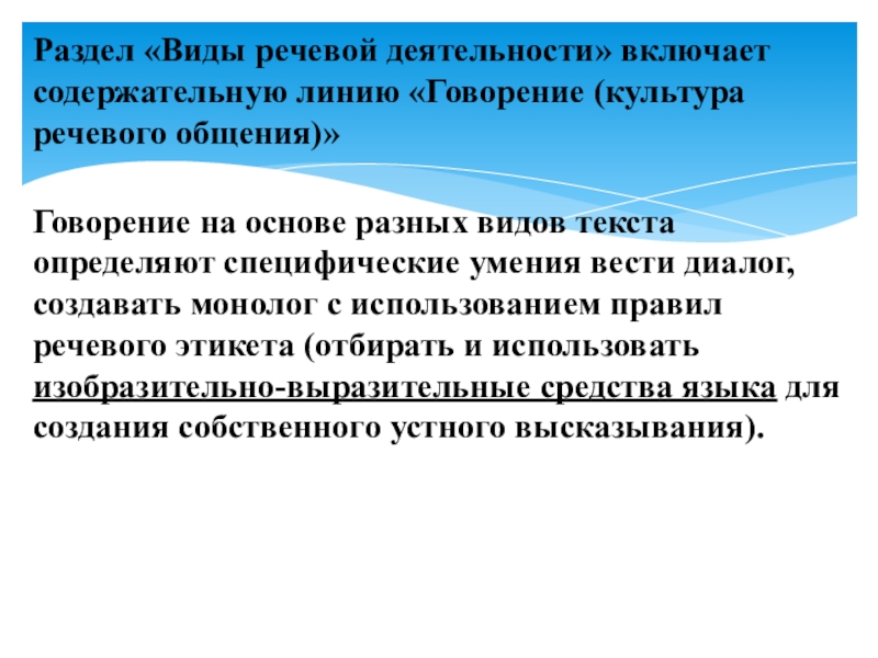 Слайд 6Раздел «Виды речевой деятельности» включает содержательную линию «Говорение (культура речевого общения)»
