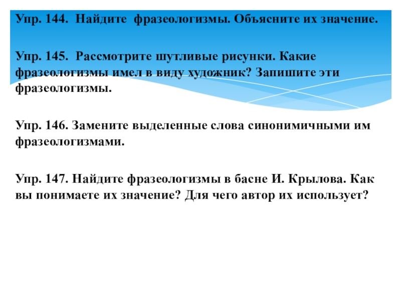 Слайд 32Упр. 144. Найдите фразеологизмы. Объясните их значение.