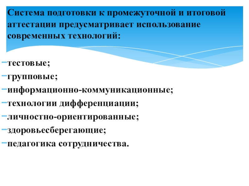 Слайд 44Система подготовки к промежуточной и итоговой аттестации предусматривает использование современных технологий: