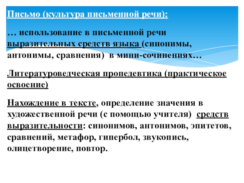 Нахождение в тексте, определение значения в художественной речи (с помощью учителя) средств выразительности: синонимов, антонимов, эпитетов, сравнений, метафор, гипербол, звукопись, олицетворение, повтор.