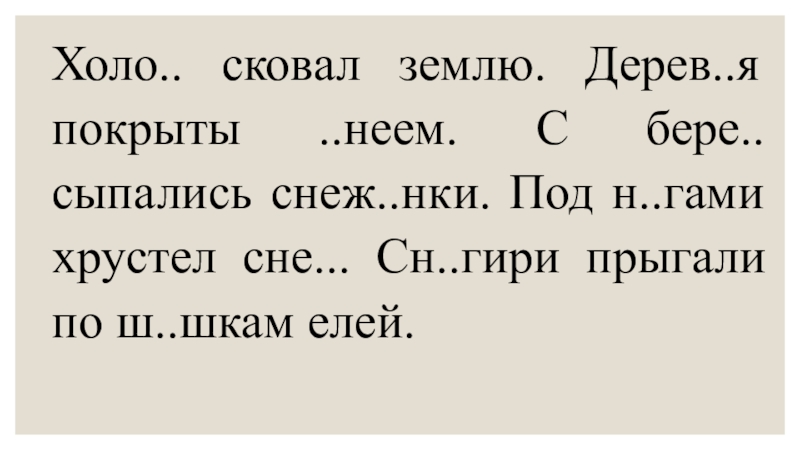 Слайд 3Холо.. сковал землю. Дерев..я покрыты ..неем. С бере.. сыпались снеж..нки. Под