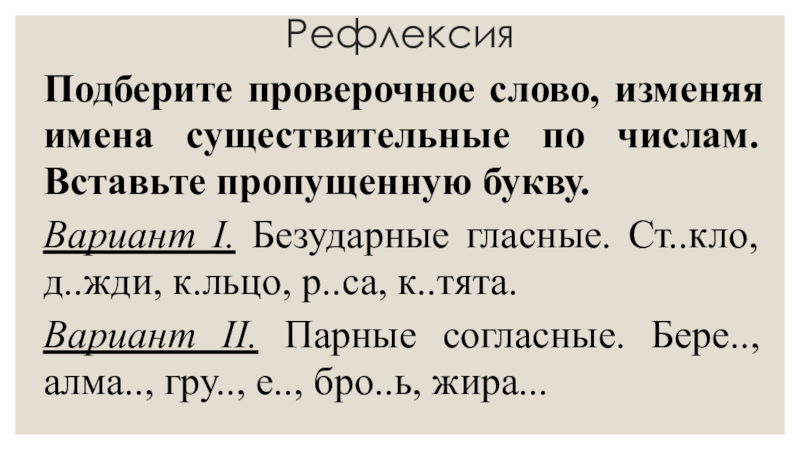 РефлексияПодберите проверочное слово, изменяя имена существи­тельные по числам. Вставьте пропущенную букву.Вариант I. Безударные гласные. Ст..кло, д..жди, к.льцо,