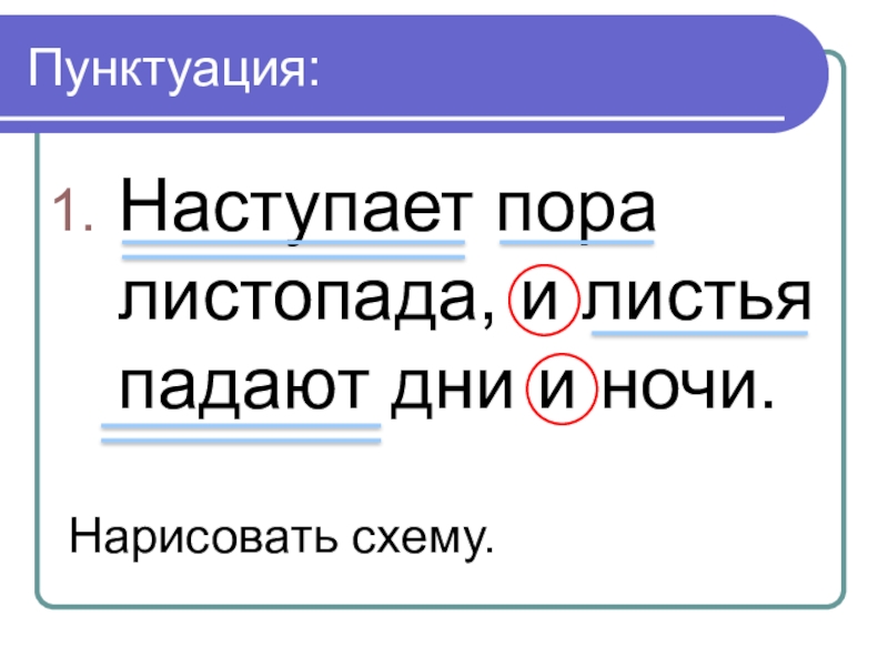 Пунктуация:Наступает пора листопада, и листья падают дни и ночи.Нарисовать схему.