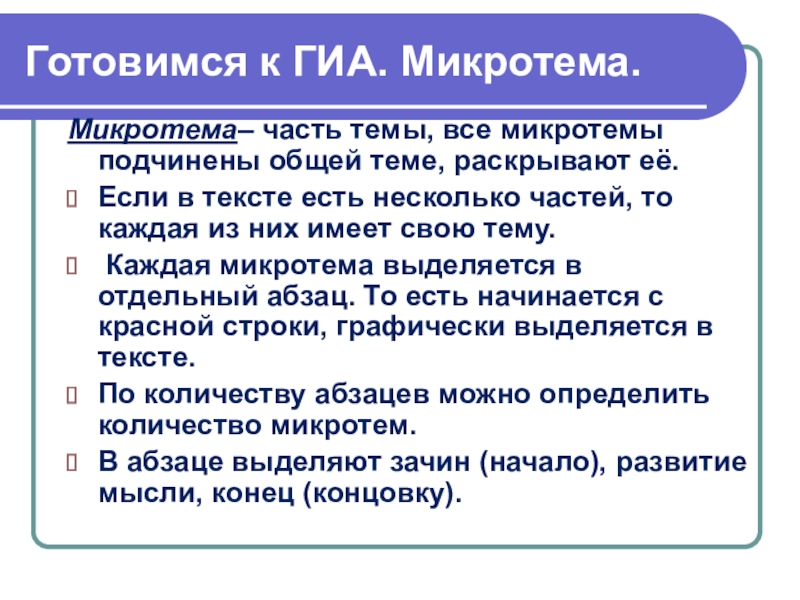 Готовимся к ГИА. Микротема. Микротема– часть темы, все микротемы подчинены общей теме, раскрывают её.Если в тексте есть