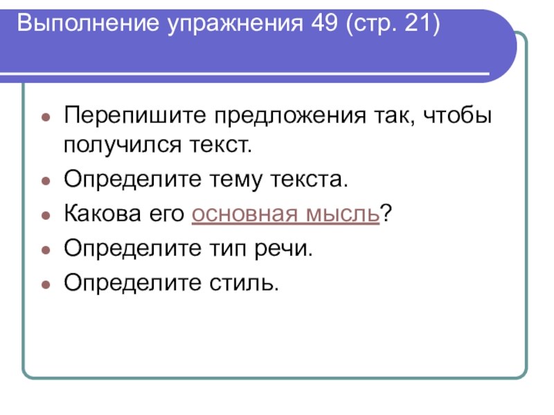Выполнение упражнения 49 (стр. 21) Перепишите предложения так, чтобы получился текст.Определите тему текста.Какова его основная мысль?Определите тип
