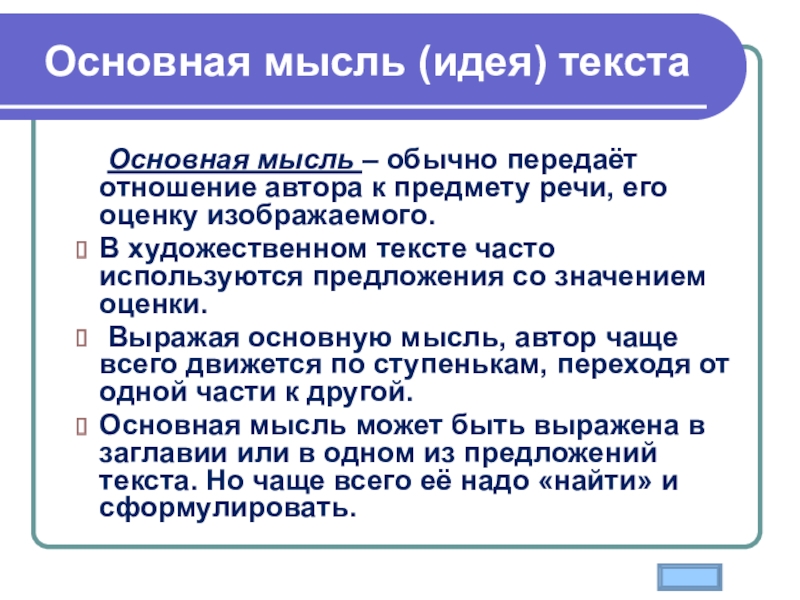 Основная мысль (идея) текста	Основная мысль – обычно передаёт отношение автора к предмету речи, его оценку изображаемого. В