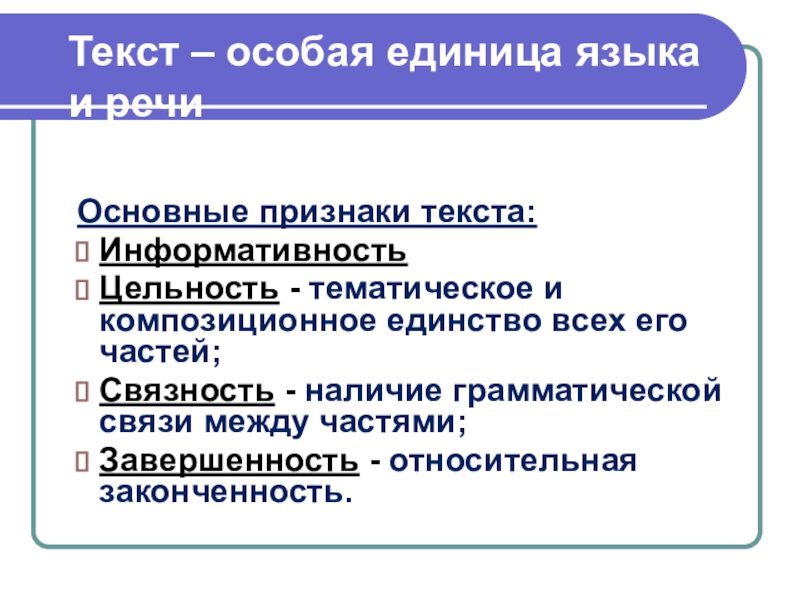 Текст – особая единица языка и речиОсновные признаки текста:ИнформативностьЦельность - тематическое и композиционное единство всех его частей;Связность