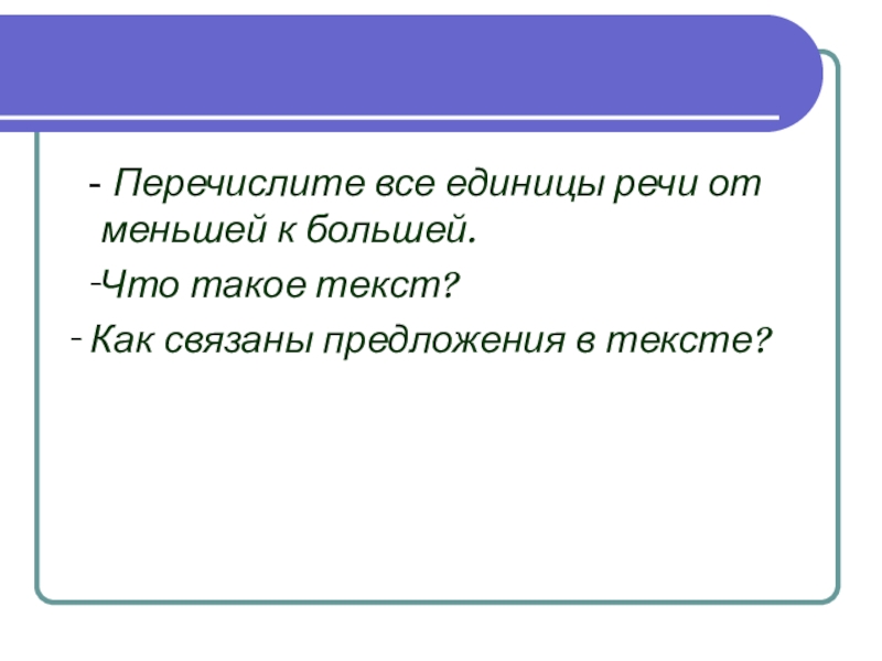 - Перечислите все единицы речи от меньшей к большей. -Что такое текст?- Как связаны предложения в
