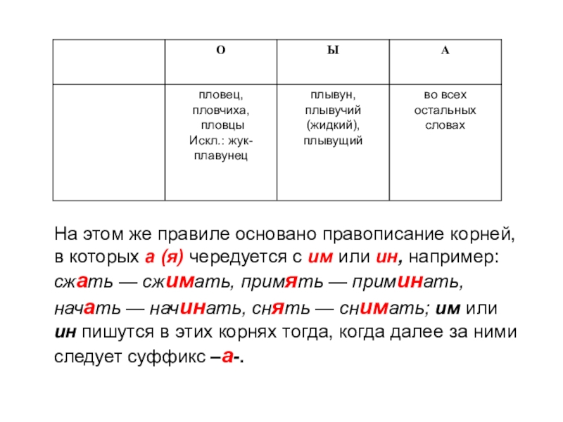 На этом же правиле основано правописание корней, в которых а (я) чередуется с им или ин, например: