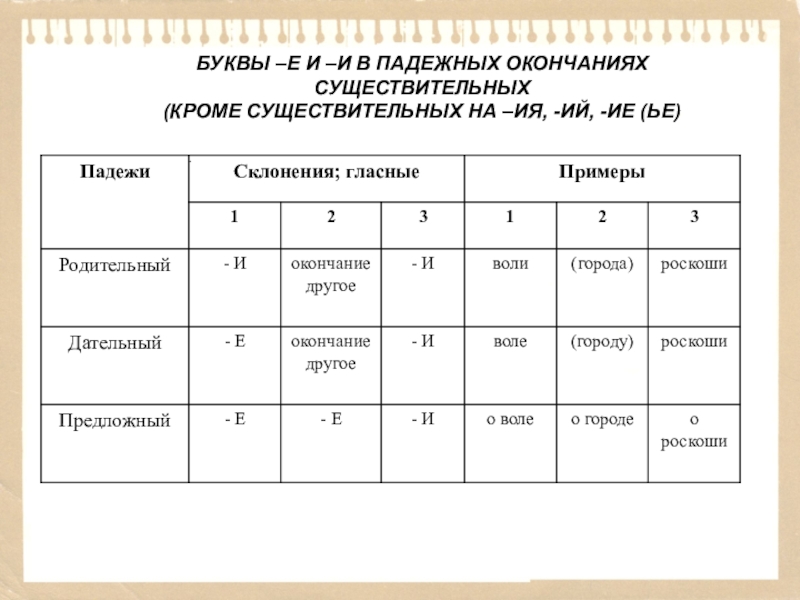 БУКВЫ –Е И –И В ПАДЕЖНЫХ ОКОНЧАНИЯХ СУЩЕСТВИТЕЛЬНЫХ (КРОМЕ СУЩЕСТВИТЕЛЬНЫХ НА –ИЯ, -ИЙ, -ИЕ (ЬЕ)