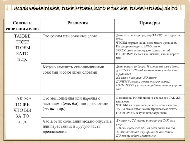 РАЗЛИЧЕНИЕ ТАКЖЕ, ТОЖЕ, ЧТОБЫ, ЗАТО И ТАК ЖЕ, ТО ЖЕ, ЧТО БЫ, ЗА ТО