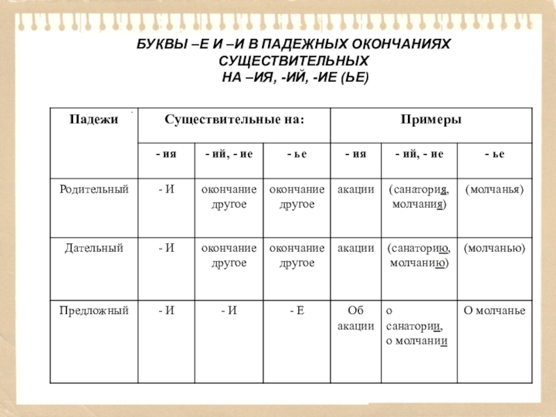 БУКВЫ –Е И –И В ПАДЕЖНЫХ ОКОНЧАНИЯХ СУЩЕСТВИТЕЛЬНЫХ НА –ИЯ, -ИЙ, -ИЕ (ЬЕ)