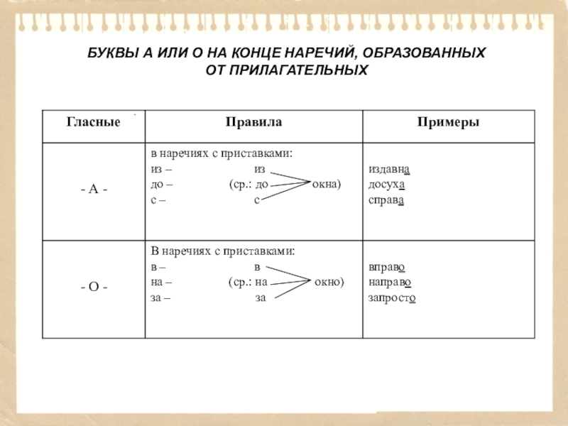 Слайд 21БУКВЫ А ИЛИ О НА КОНЦЕ НАРЕЧИЙ, ОБРАЗОВАННЫХ ОТ ПРИЛАГАТЕЛЬНЫХ