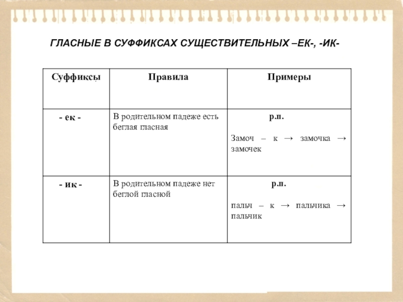 ГЛАСНЫЕ В СУФФИКСАХ СУЩЕСТВИТЕЛЬНЫХ –ЕК-, -ИК-