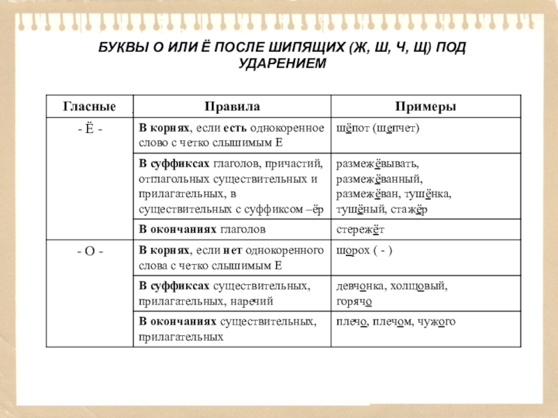 Слайд 39БУКВЫ О ИЛИ Ё ПОСЛЕ ШИПЯЩИХ (Ж, Ш, Ч, Щ) ПОД