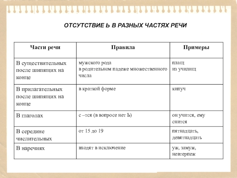 ОТСУТСТВИЕ Ь В РАЗНЫХ ЧАСТЯХ РЕЧИ