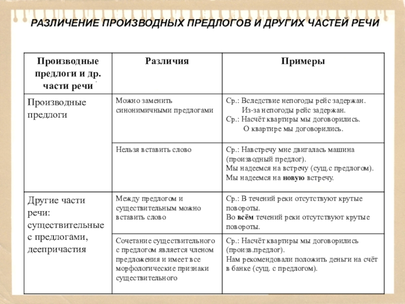 РАЗЛИЧЕНИЕ ПРОИЗВОДНЫХ ПРЕДЛОГОВ И ДРУГИХ ЧАСТЕЙ РЕЧИ