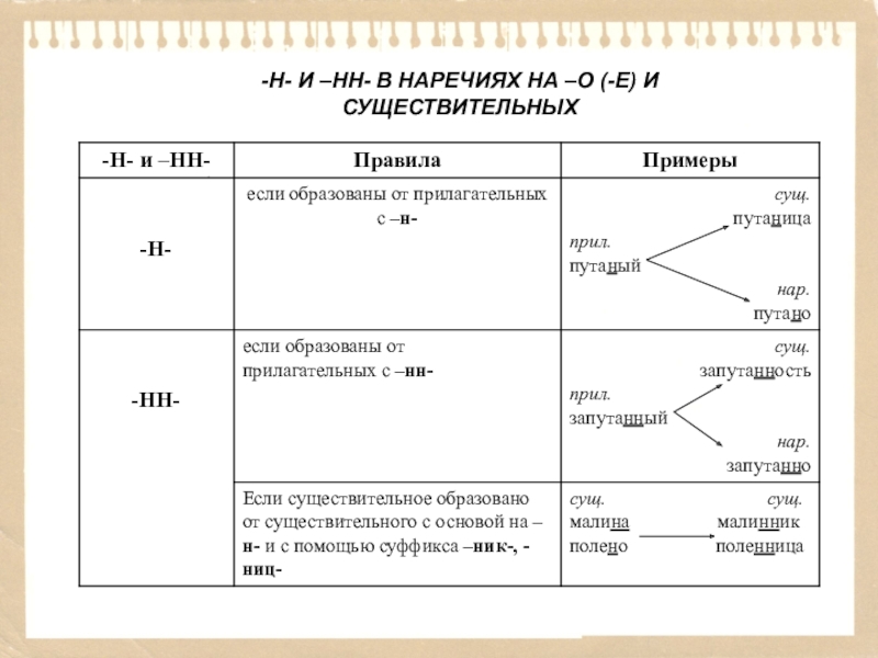 -Н- И –НН- В НАРЕЧИЯХ НА –О (-Е) И СУЩЕСТВИТЕЛЬНЫХ
