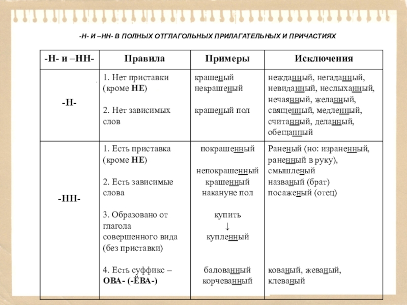 -Н- И –НН- В ПОЛНЫХ ОТГЛАГОЛЬНЫХ ПРИЛАГАТЕЛЬНЫХ И ПРИЧАСТИЯХ