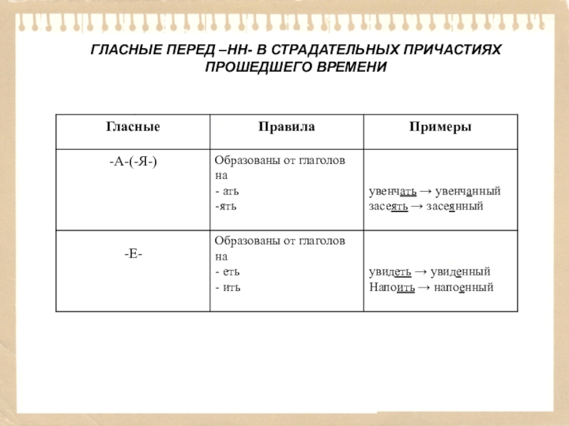 ГЛАСНЫЕ ПЕРЕД –НН- В СТРАДАТЕЛЬНЫХ ПРИЧАСТИЯХ ПРОШЕДШЕГО ВРЕМЕНИ