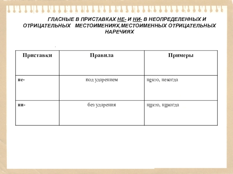 ГЛАСНЫЕ В ПРИСТАВКАХ НЕ- И НИ- В НЕОПРЕДЕЛЕННЫХ И ОТРИЦАТЕЛЬНЫХ