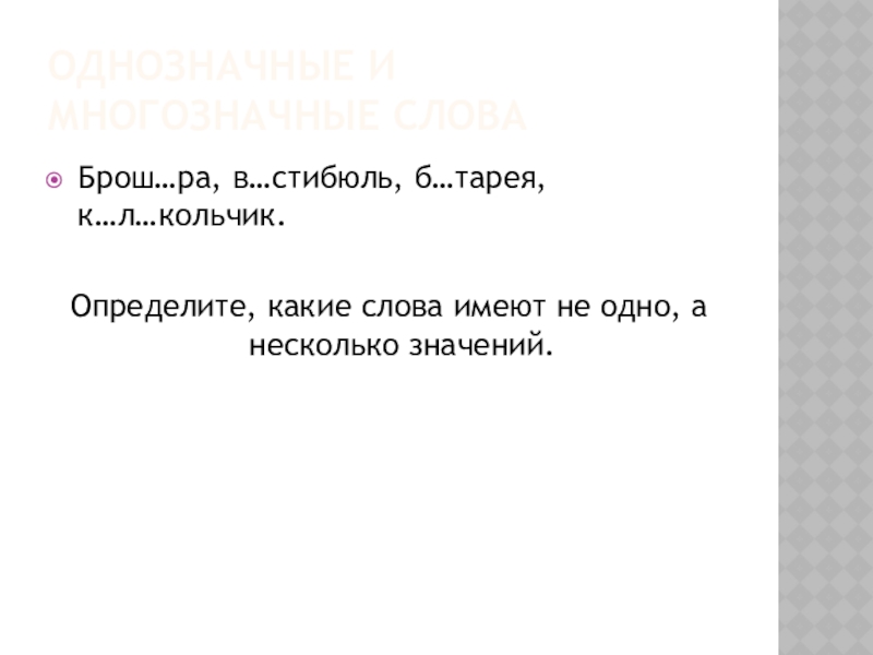 Однозначные и многозначные словаБрош…ра, в…стибюль, б…тарея, к…л…кольчик. Определите, какие слова имеют не одно, а несколько значений.