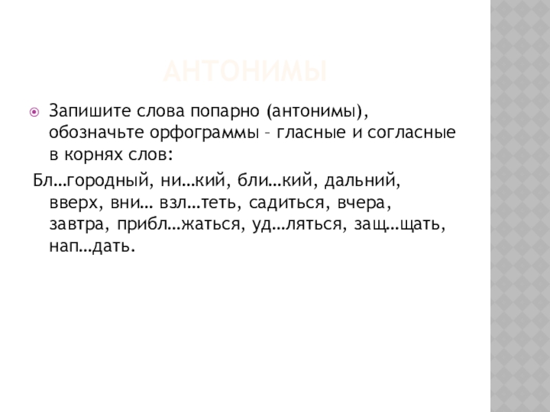 АнтонимыЗапишите слова попарно (антонимы), обозначьте орфограммы – гласные и согласные в корнях слов:Бл…городный, ни…кий, бли…кий, дальний, вверх,