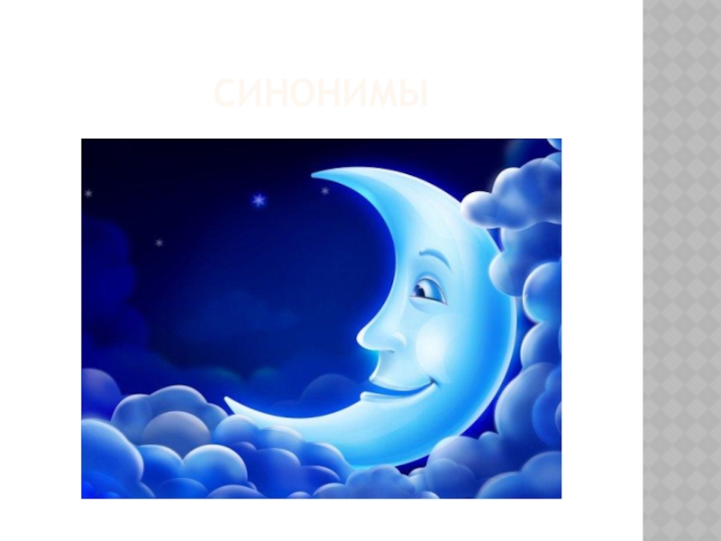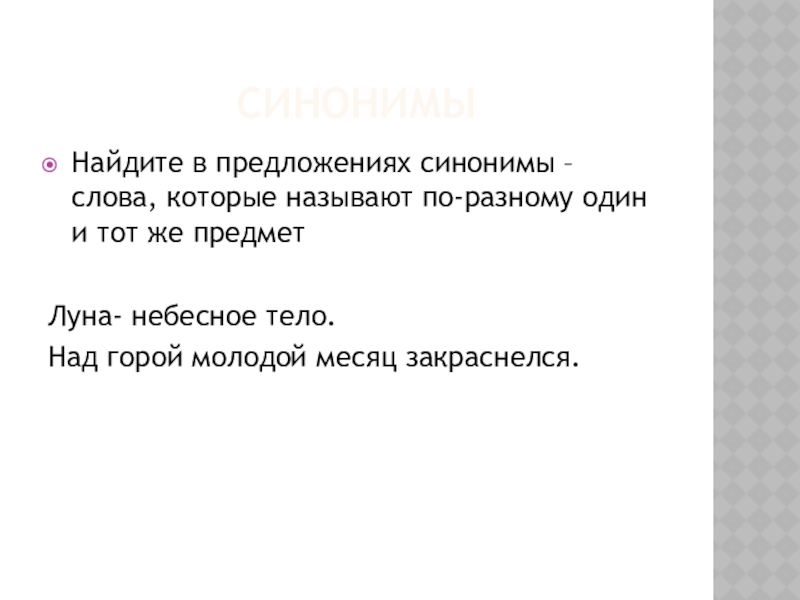 СинонимыНайдите в предложениях синонимы – слова, которые называют по-разному один и тот же предметЛуна- небесное тело.Над горой