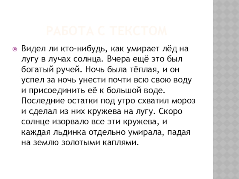 Работа с текстомВидел ли кто-нибудь, как умирает лёд на лугу в лучах солнца. Вчера ещё это был