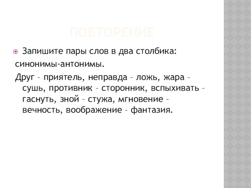 ПовторениеЗапишите пары слов в два столбика:синонимы-антонимы.Друг – приятель, неправда – ложь, жара – сушь, противник – сторонник,
