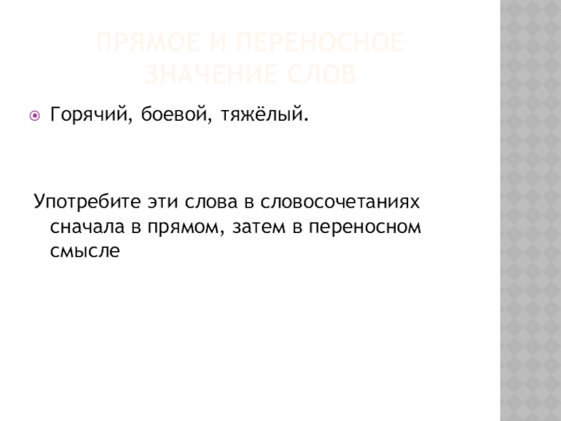 Прямое и переносное значение словГорячий, боевой, тяжёлый.Употребите эти слова в словосочетаниях сначала в прямом, затем в переносном