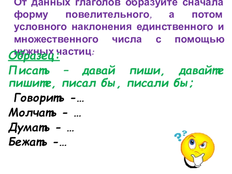 Писать – давай пиши, давайте пишите, писал бы, писали бы;