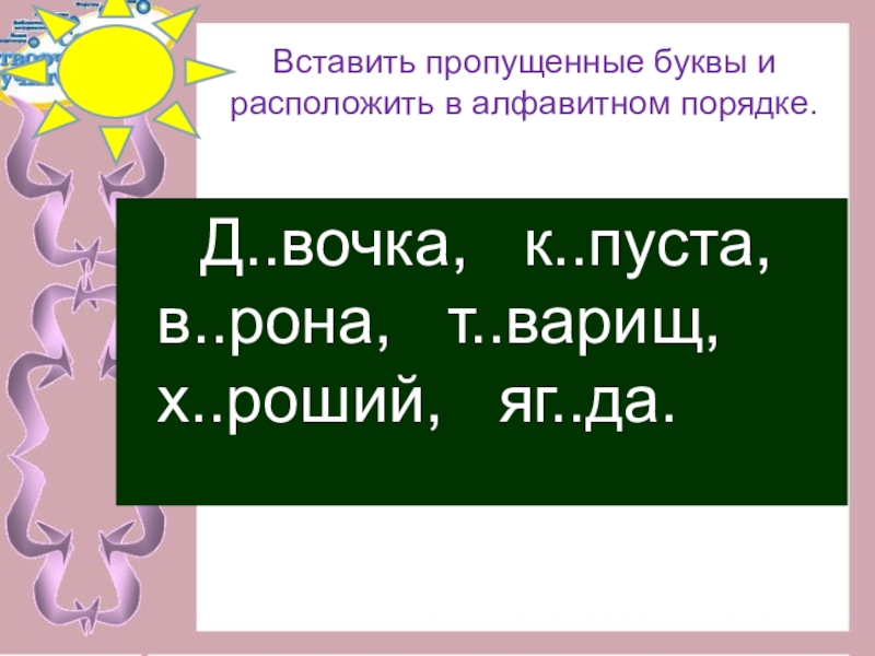 Слайд 10Вставить пропущенные буквы и расположить в алфавитном порядке.