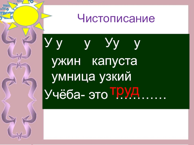 ЧистописаниеУ у   у  Уу  у ужин  капуста умница узкийУчёба- это …………