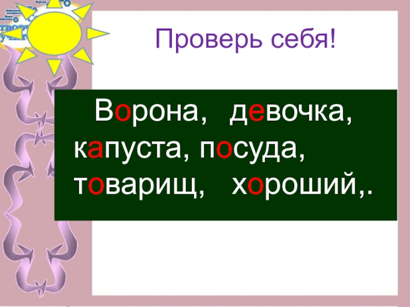 Проверь себя!    Ворона,  девочка,  капуста, посуда,  товарищ,  хороший,.