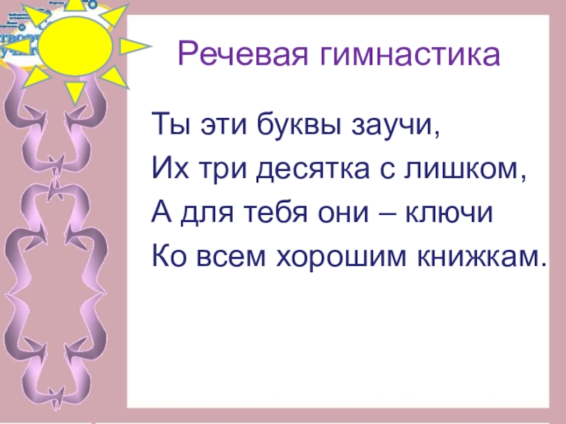 Речевая гимнастикаТы эти буквы заучи,Их три десятка с лишком,А для тебя они – ключиКо всем хорошим книжкам.