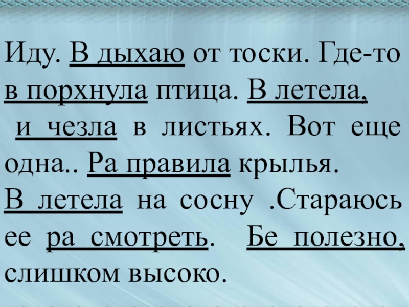 Слайд 9Иду. В дыхаю от тоски. Где-то в порхнула птица. В летела,