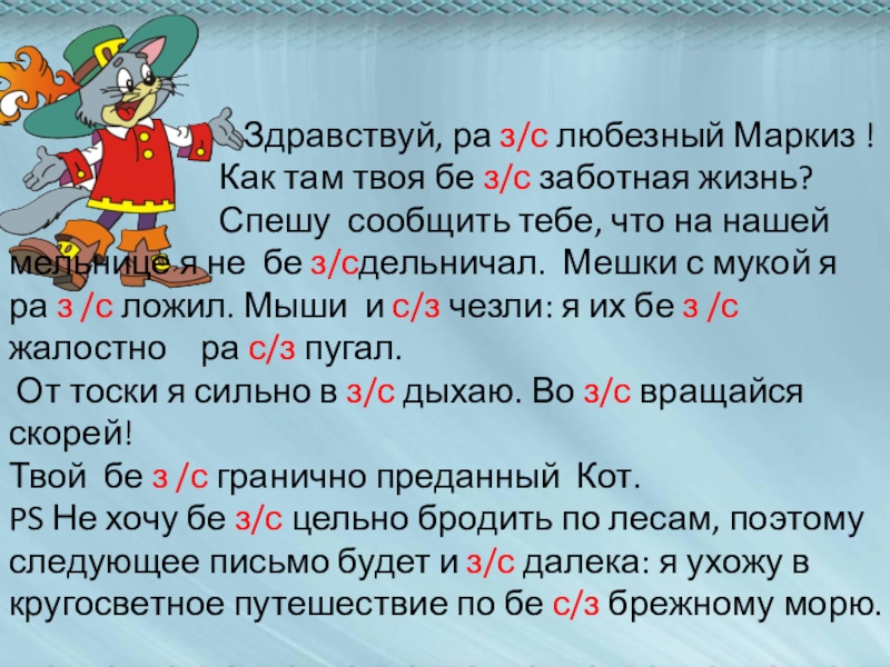Спешу сообщить тебе, что на нашей мельнице я не бе з/сдельничал. Мешки с мукой я ра з /с ложил. Мыши и с/з чезли: я их бе з /с жалостно ра с/з пугал.