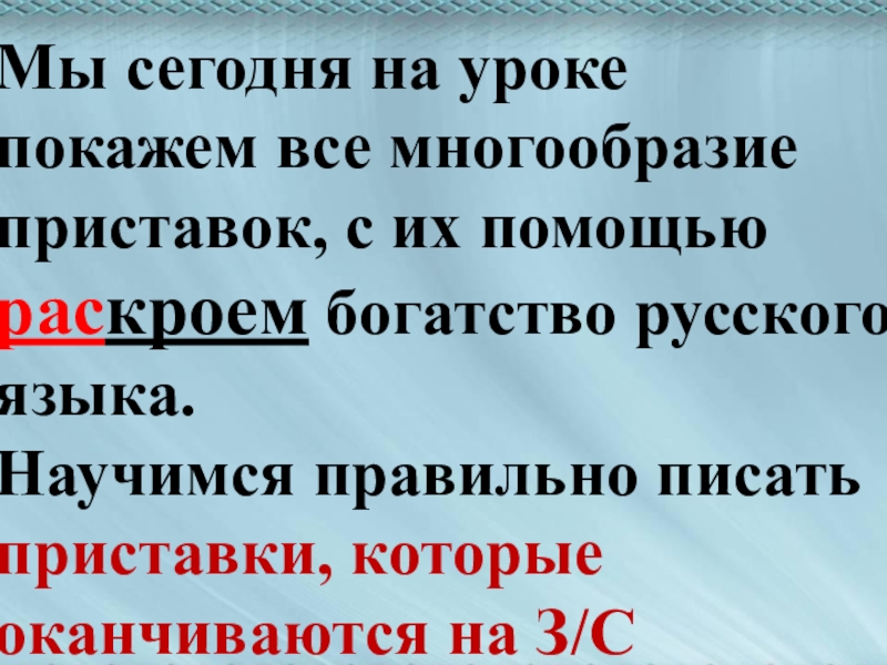 Мы сегодня на уроке покажем все многообразие приставок, с их помощьюраскроем богатство русского языка.Научимся правильно писать приставки,