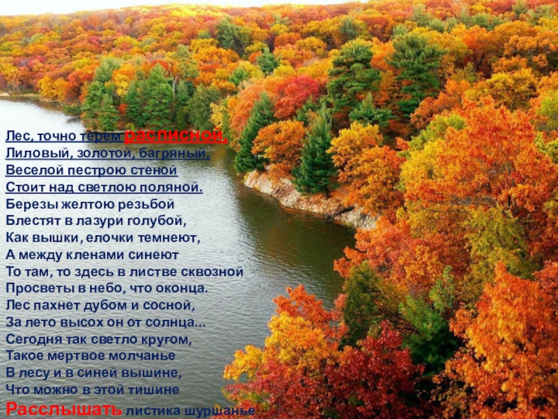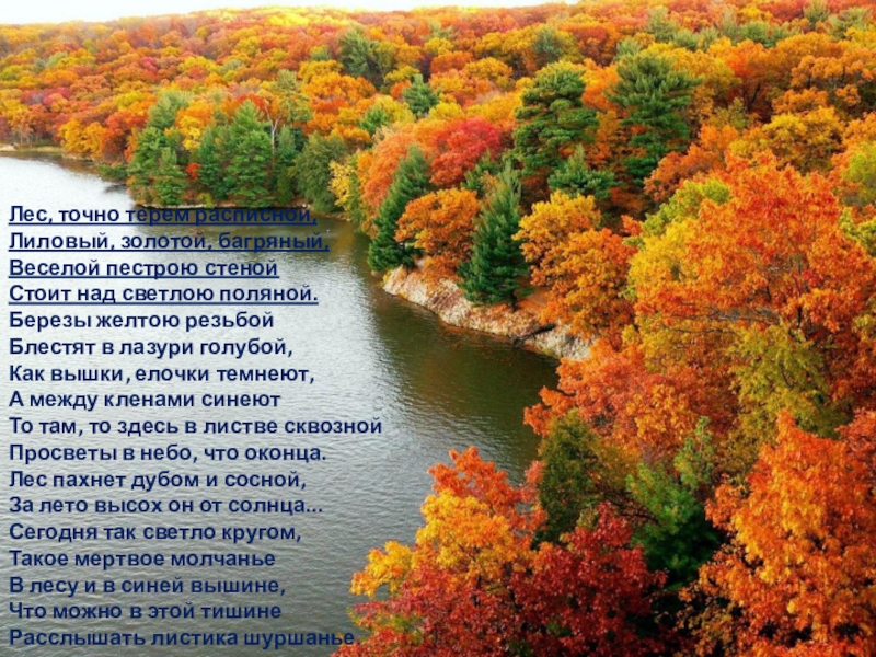 Слайд 7Лес, точно терем расписной,  Лиловый, золотой, багряный,  Веселой пестрою стеной  Стоит над светлою поляной.  Березы