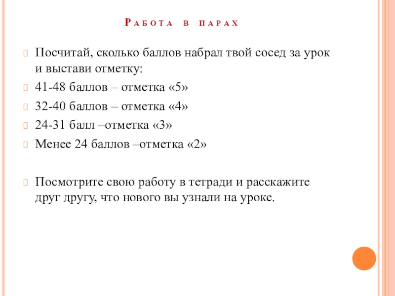 Посмотрите свою работу в тетради и расскажите друг другу, что нового вы узнали на уроке.